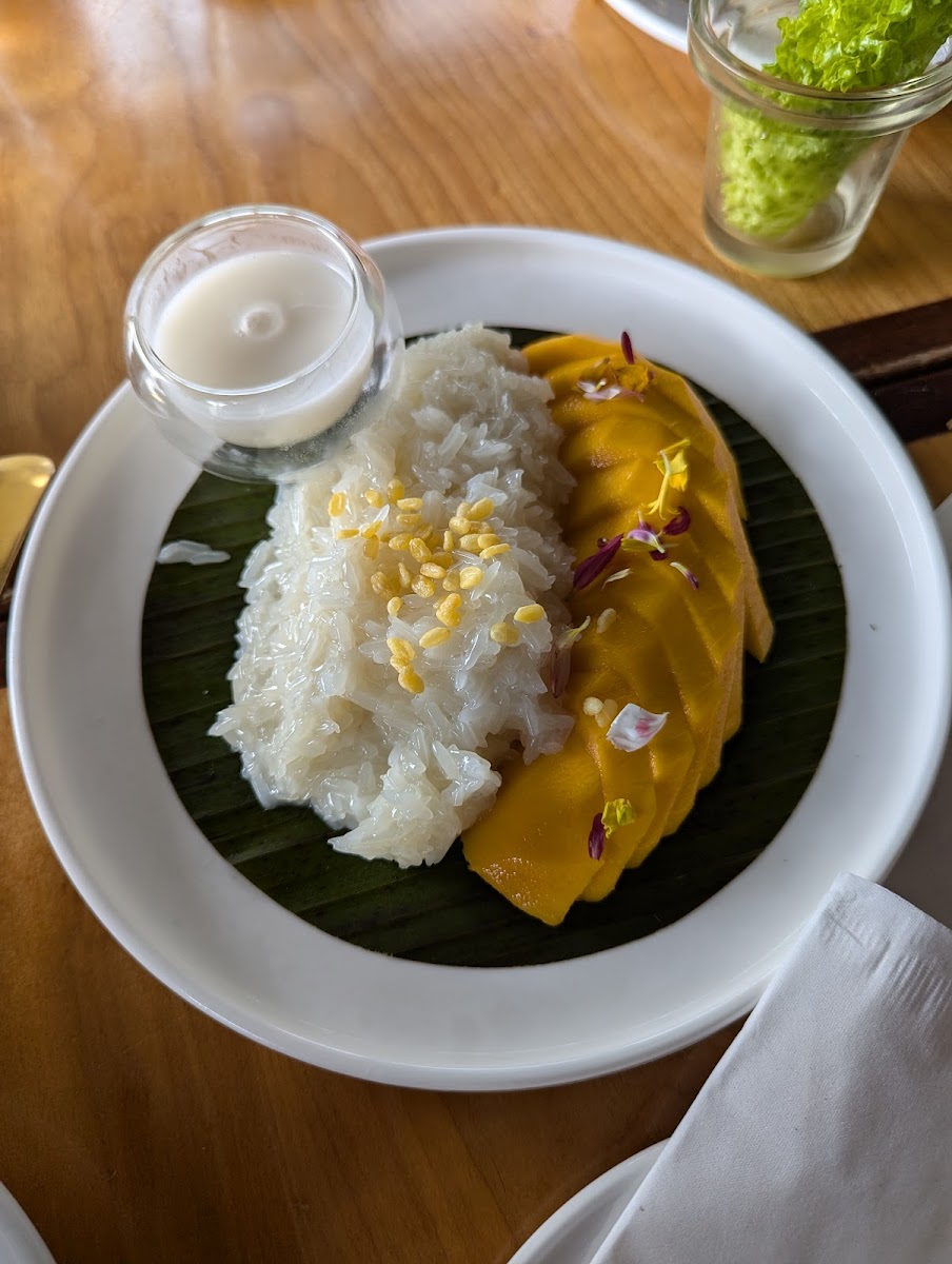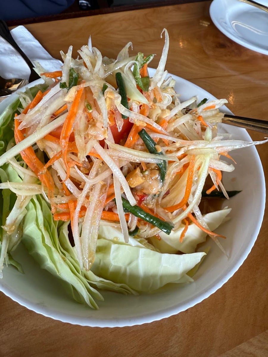 One of the standout dishes on the menu is the Som Tum GF. This vibrant papaya salad, served with fresh vegetables, peanuts, and a tangy lime dressing, is a perfect balance of spicy and sour. It's not only a refreshing appetizer but also an ideal choice for those looking for gluten-free options. For a lighter meal, the Kale Salad is a great choice. Packed with nutrient-rich greens and topped with a zesty dressing, it's both delicious and healthy. If you have a sweet tooth, don’t miss out on the Mango Sticky Rice. This classic Thai dessert, made with ripe mango and creamy coconut sticky rice, is the perfect ending to your meal.