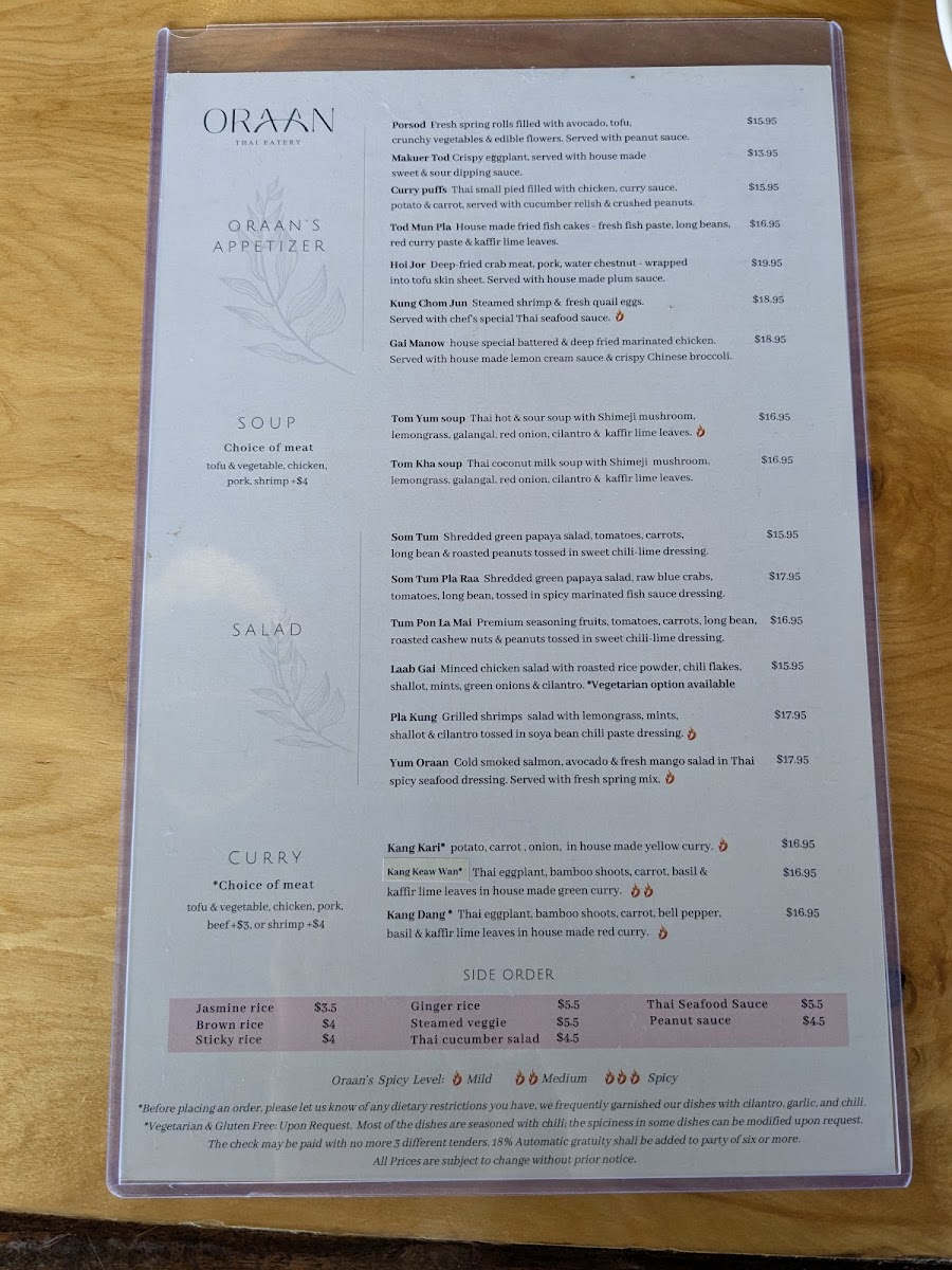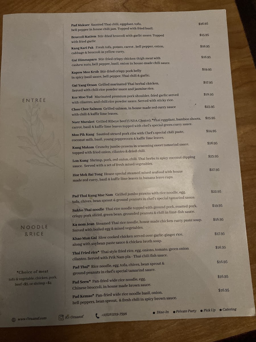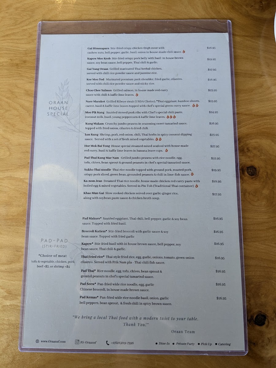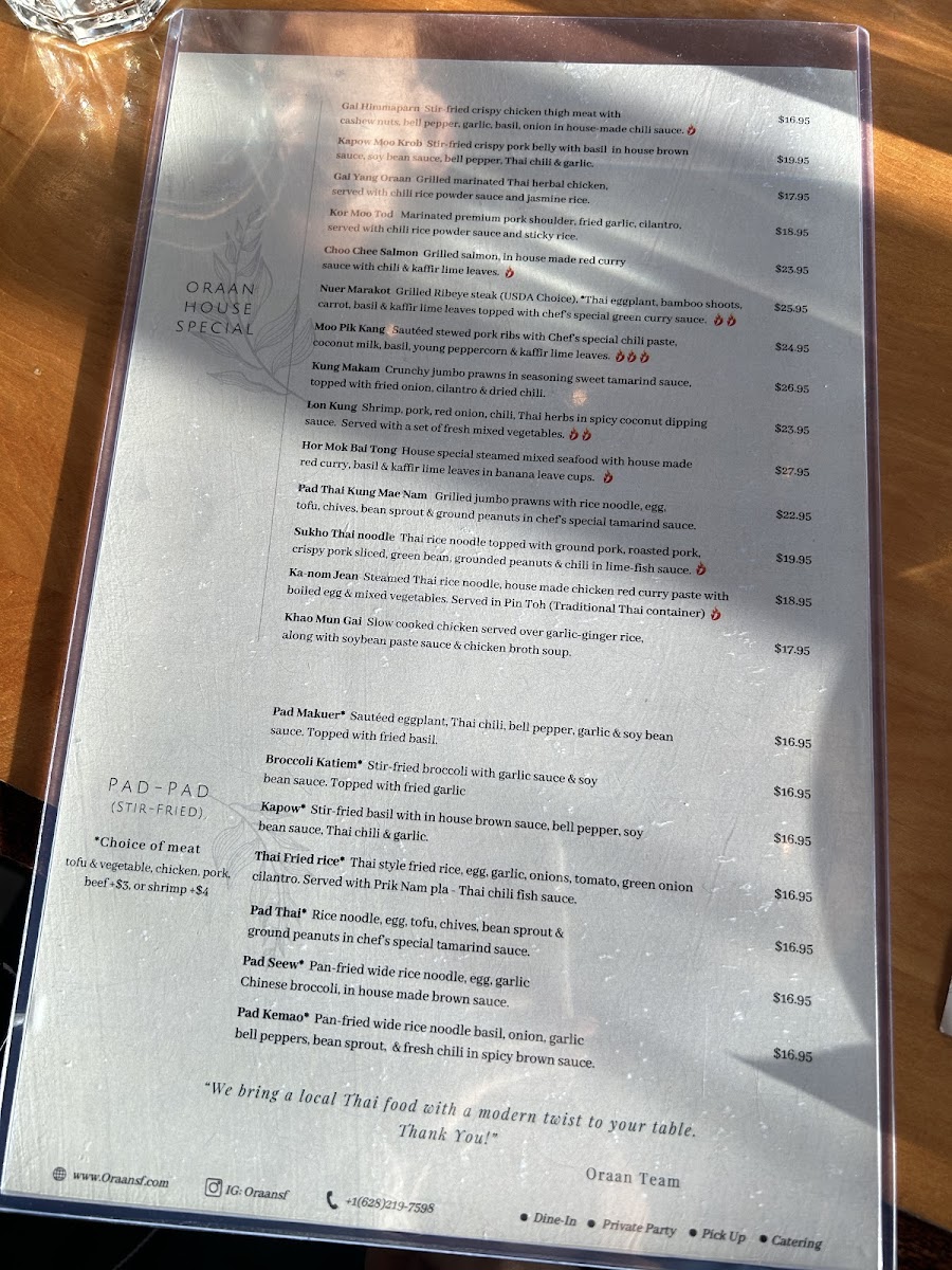 From a reviewer’s perspective, Oraan Thai Eatery’s menu at 3750 Geary Blvd is a vibrant showcase of traditional Thai flavors with thoughtful variety. The Oraan Appetizers, including Porsod, Makuer Tod, Curry Puffs, Tod Mun Pla, and Hoi Jor, offer a perfect start with crispy textures and bold flavors. Their Salads-Som Tum, Som Tum Pla Raa, Som Tum Pon La Mai, Laab Gai, and Pla Kung-provide a refreshing, tangy balance, highlighting fresh ingredients and authentic seasoning. The Oraan House Specials like Gai Himmaparn, Nuer Marakot, Kor Moo Tod, Moo Pik Kang, and Kapow Moo Krob bring hearty, flavorful proteins with signature Thai spice levels. For stir-fry lovers, the Pad-Pad section delivers classics such as Thai Fried Rice, Pad Thai, Pad Seew, Pad Kemao, and Pad Makuer, each dish offering a comforting yet lively taste. Soups like Tom Yum Soup and Tom Ka Soup are aromatic and perfectly spiced, while the Side Orders, including Jasmine Rice, Brown Rice, Sticky Rice, Ginger Rice, and Steamed Veggie, round out meals effortlessly. Beverages such as Thai Iced Tea, Thai Iced Coffee, Thai Iced Longan Juice, Organic Lemonade, and the visually striking Butterfly Pea Strawberry Lemonade complement the food beautifully. For curry enthusiasts, choices like Kang Kari, Kang Keaw Wan, and Kang Dang provide rich, creamy sauces with complex layers of flavor. Finally, the menu concludes with a sweet touch in the form of Mango Sticky Rice, a beloved Thai dessert that leaves a memorable finish. Overall, the menu at Oraan Thai Eatery offers a carefully curated mix of appetizers, salads, mains, and desserts, each dish reflecting authentic Thai culinary traditions while remaining approachable and satisfying.