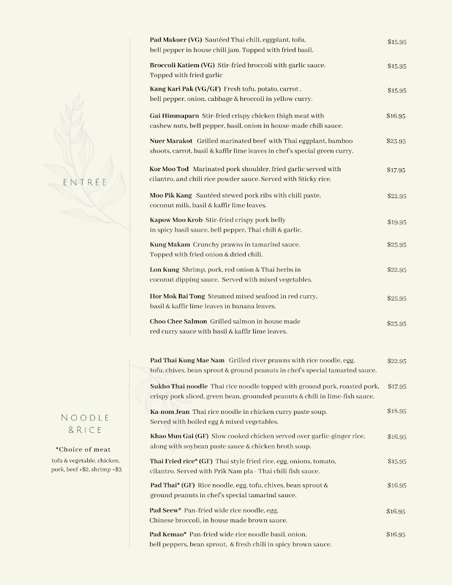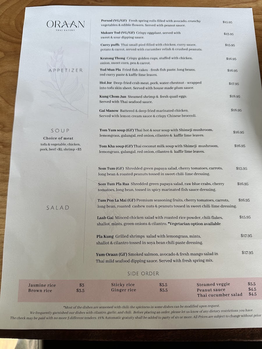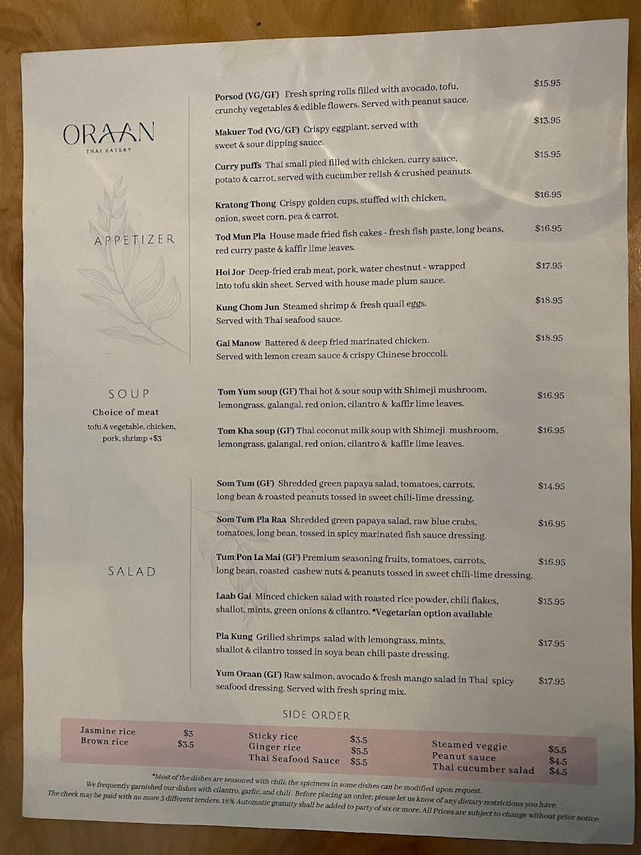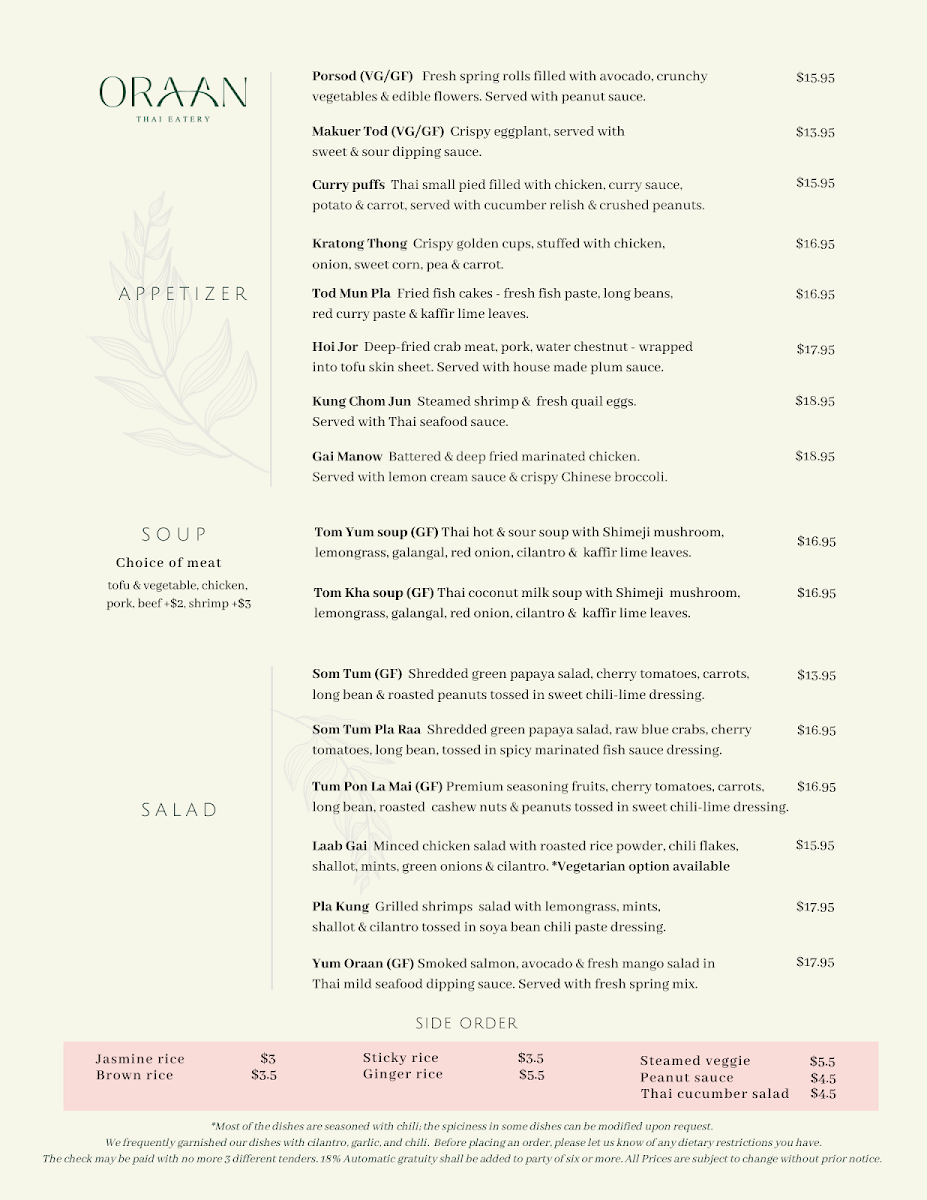 From a reviewer’s perspective, Oraan Thai Eatery’s menu at 3750 Geary Blvd is a vibrant showcase of traditional Thai flavors with thoughtful variety. The Oraan Appetizers, including Porsod, Makuer Tod, Curry Puffs, Tod Mun Pla, and Hoi Jor, offer a perfect start with crispy textures and bold flavors. Their Salads-Som Tum, Som Tum Pla Raa, Som Tum Pon La Mai, Laab Gai, and Pla Kung-provide a refreshing, tangy balance, highlighting fresh ingredients and authentic seasoning. The Oraan House Specials like Gai Himmaparn, Nuer Marakot, Kor Moo Tod, Moo Pik Kang, and Kapow Moo Krob bring hearty, flavorful proteins with signature Thai spice levels. For stir-fry lovers, the Pad-Pad section delivers classics such as Thai Fried Rice, Pad Thai, Pad Seew, Pad Kemao, and Pad Makuer, each dish offering a comforting yet lively taste. Soups like Tom Yum Soup and Tom Ka Soup are aromatic and perfectly spiced, while the Side Orders, including Jasmine Rice, Brown Rice, Sticky Rice, Ginger Rice, and Steamed Veggie, round out meals effortlessly. Beverages such as Thai Iced Tea, Thai Iced Coffee, Thai Iced Longan Juice, Organic Lemonade, and the visually striking Butterfly Pea Strawberry Lemonade complement the food beautifully. For curry enthusiasts, choices like Kang Kari, Kang Keaw Wan, and Kang Dang provide rich, creamy sauces with complex layers of flavor. Finally, the menu concludes with a sweet touch in the form of Mango Sticky Rice, a beloved Thai dessert that leaves a memorable finish. Overall, the menu at Oraan Thai Eatery offers a carefully curated mix of appetizers, salads, mains, and desserts, each dish reflecting authentic Thai culinary traditions while remaining approachable and satisfying.